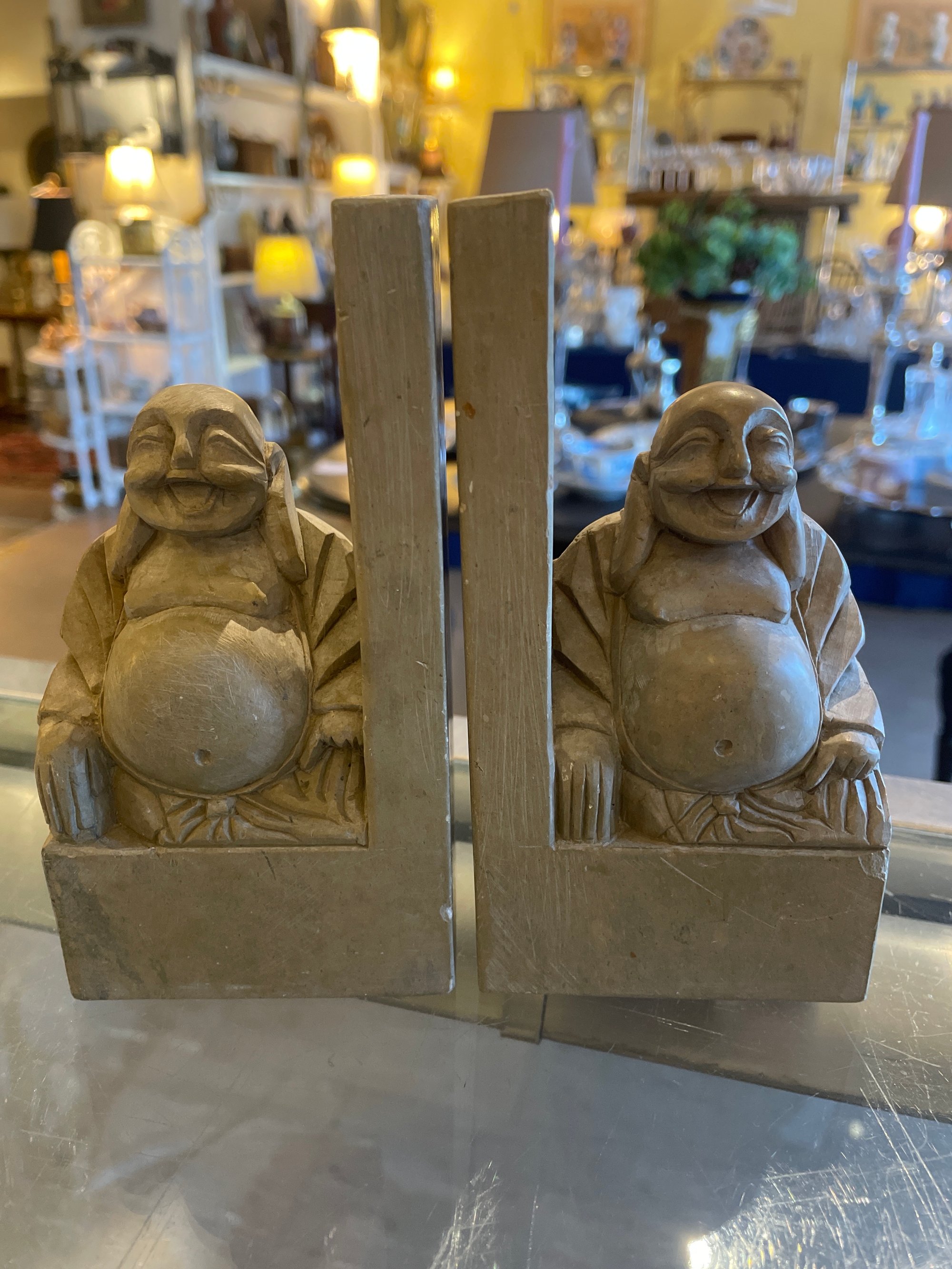 Antique Chinese hand carved soapstone Buddha bookends. 5.5” Height.