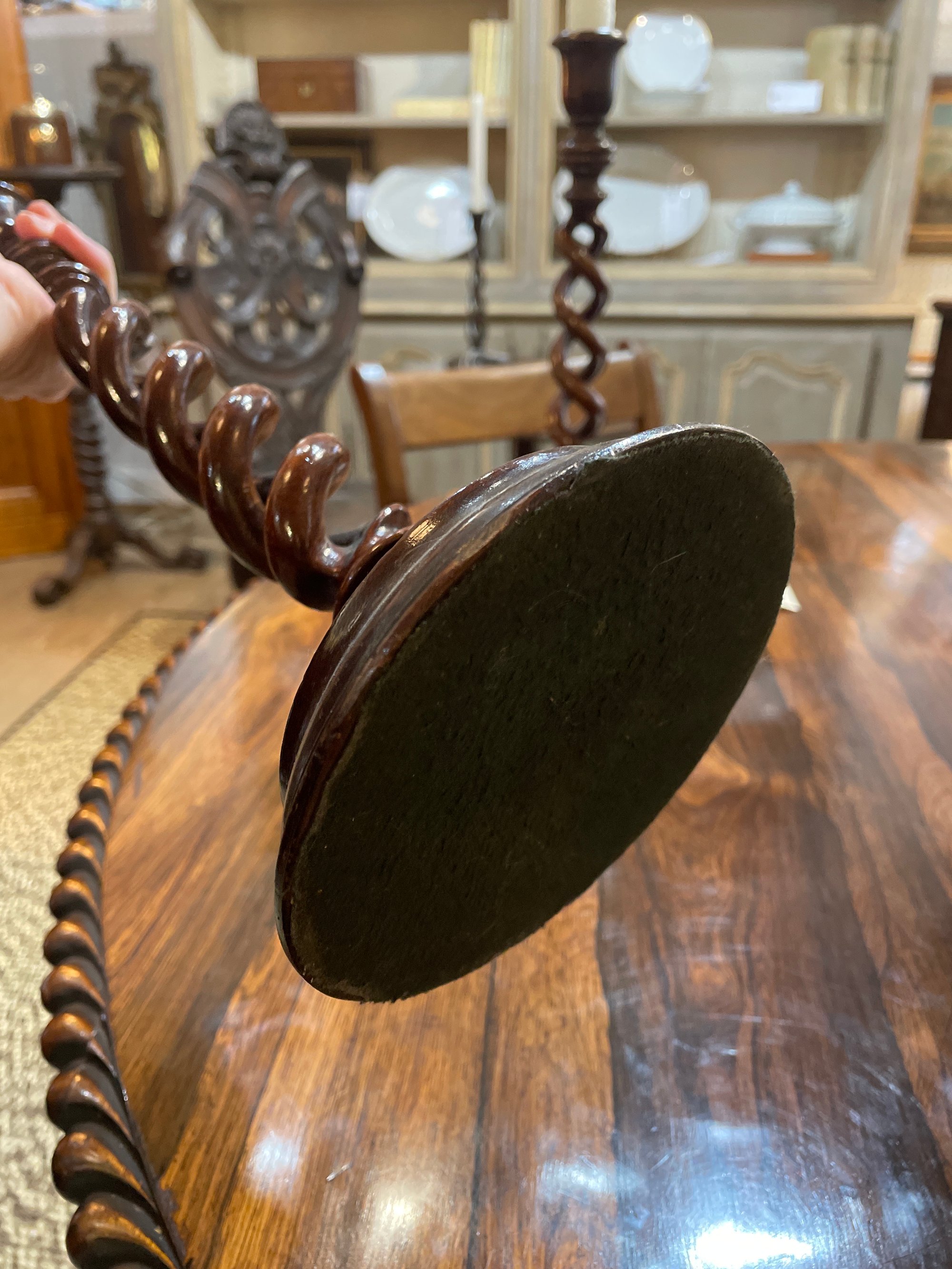 Pair of 14” tall English open twist MAHOGANY candle sticks. Spectacular. 19th century.