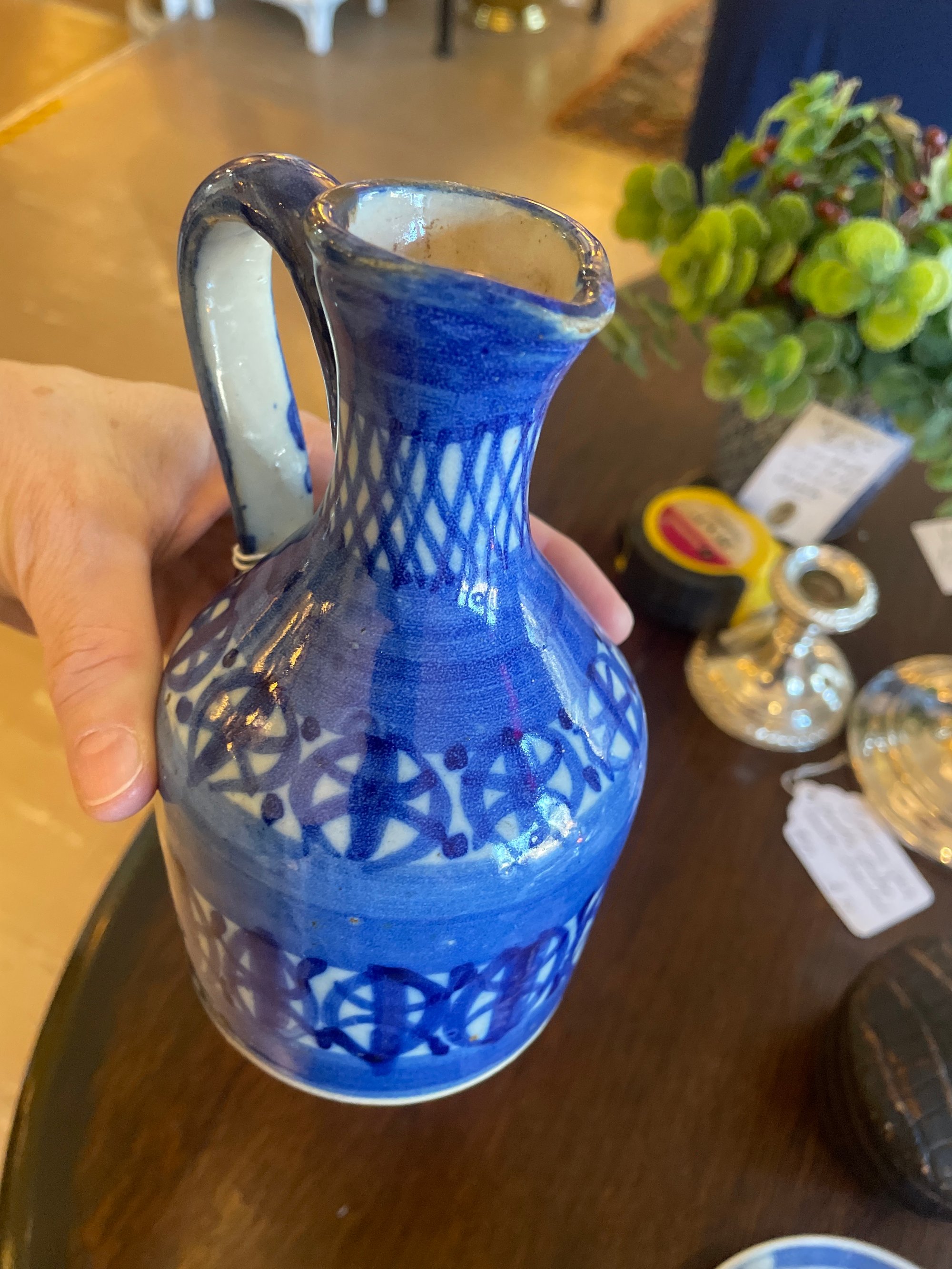 A lovely blue and white decorated stoneware jug or pitcher. 6” tall.